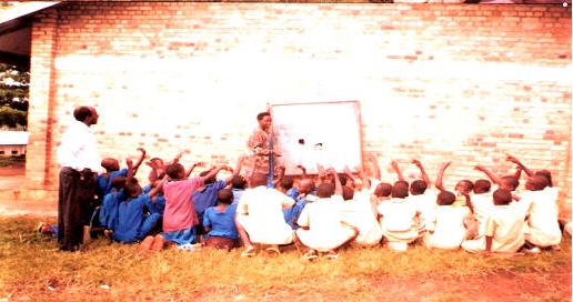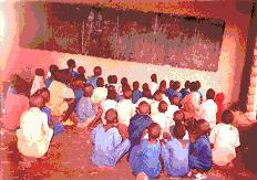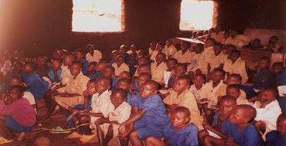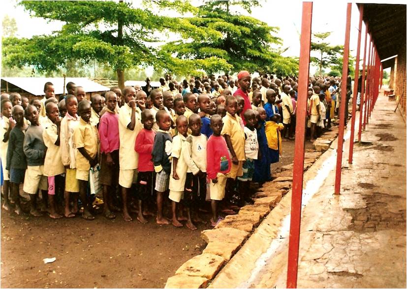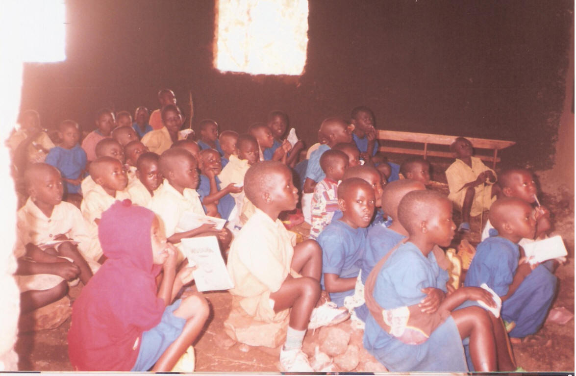 I bambini della "Scuola di Alfredo" a Muringa (Rwanda). Tanti bambini studiano così, sulla terra! Hanno bisogno di banchi e sedie.
